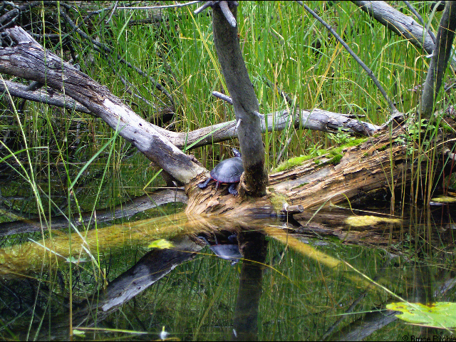 Painted Turtle, Pinery PP The comination of the Painted Turtle along with the reflection and refraction of the log in the water provides a peaceful image. |
