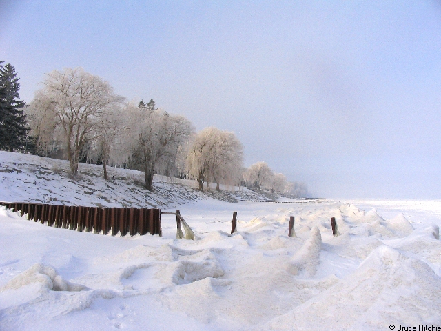 Winter beach on Lake Huron at Bright's Grove The Lake Huron shoreline provides an ever changing panorama. This image shows hoarfrost on the willows and ice mountains and "volcanos" formed by winter storms on the lake. |